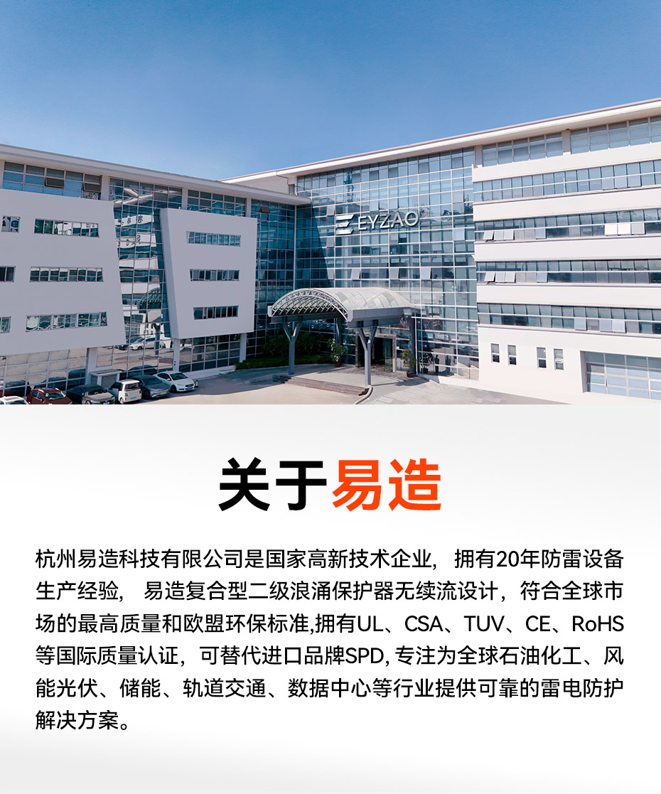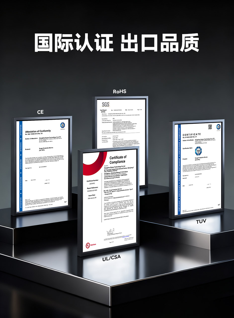 易造T2級(jí)大通流浪涌保護(hù)器,擁有UL、TUV.CE、COC等國(guó)內(nèi)國(guó)際質(zhì)量認(rèn)證,符合全球市場(chǎng)的最高安全和RoHS歐盟環(huán)保標(biāo)準(zhǔn),可替代進(jìn)口品牌SPD,支持出口。